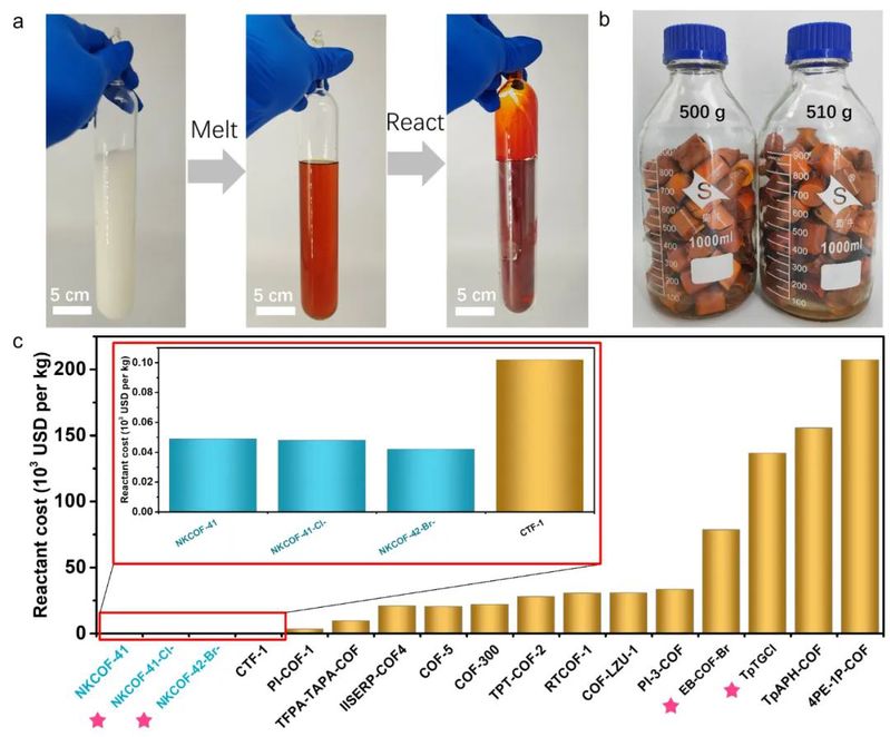 图3. (a) 一步合成百克级NKCOF-41示意图;(b) 千克级NKCOF-41的照片;(c) NKCOF-41、NKCOF-41-Cl–和NKCOF-42-Br–的反应物成本及与报道的廉价COFs的对比。