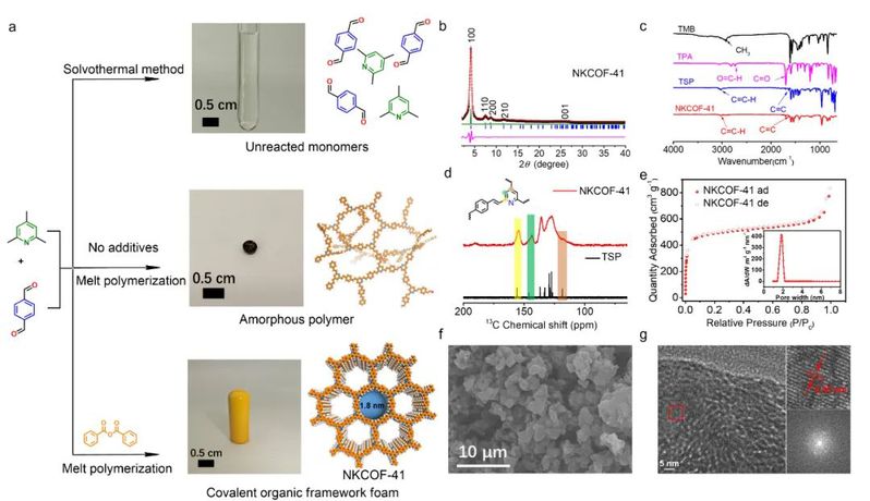 图2. (a) 构建基于可力丁的乙烯基COFs的示意图;(b) NKCOF-41 的X射线粉末衍射图;(c) 模型分子、NKCOF-41和相应单体的红外光谱; (d) NKCOF-41和模型分子的 13C NMR谱图;(e) NKCOF-41在77 K的N2吸脱附曲线;(f) NKCOF-41的扫描电子显微镜图像;(g) NKCOF-41的透射电子显微镜图像。