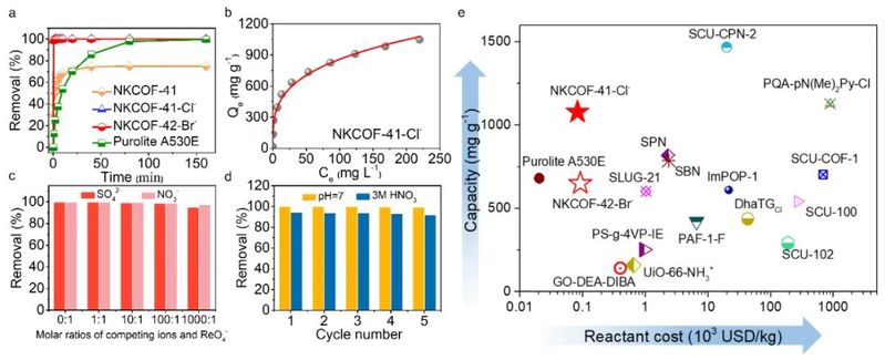 图 4. (a) COFs与商业离子交换树脂的Purolite A530E对ReO4–的吸附动力学;(b)NKCOF-41-Cl–对ReO4–的吸附等温线;(c)竞争阴离子的影响研究;(d) NKCOF-41-Cl–去除ReO4–的循环利用性;(e) 吸附剂的吸附容量和成本对比。