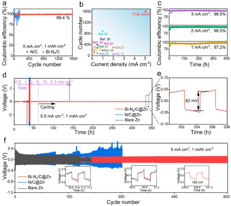Bi-N4/C在1600次循环中表现出较高的平均库仑效率∼99.4%(图4a)。与那些电解质工程改性的锌金属负极相比,Bi-N4/C电极在零度以下显示出更高的倍率能力,且循环寿命更长(图4b)。此外,Bi-N4/C在1、2和3 mA cm-2的不同电流密度下可以在600 h内保持较高的平均库仑效率(图4c),表明其在恶劣环境下具有出色的可逆性。