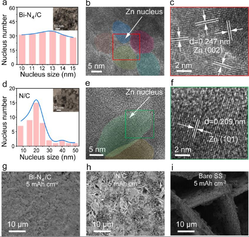 图3.(a,d)Zn成核尺寸。插图:对应的TEM图像。(b,c)Bi−N4/C和(e,f)N/C衬底上Zn核的HR-TEM图像。(g)Bi-N4/C,(h)N/C和(i)裸SS上沉积Zn的SEM图像。