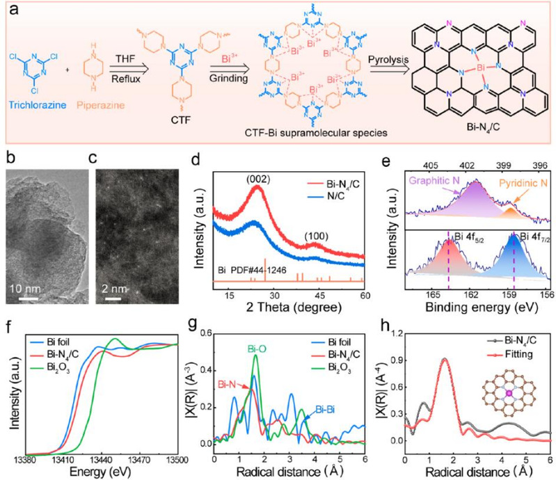图1.Bi-N4/C材料的合成与表征。(a)Bi-N4/C合成原理图。(b)TEM图像。(c)HAADF-STEM形象。(d)XRD图谱。(e)XPS N 1s光谱(上)和Bi 4f光谱(下)。(f)Bi L3边XANES和(g) EXAFS光谱。(h)Bi−N4/C的EXAFS拟合。