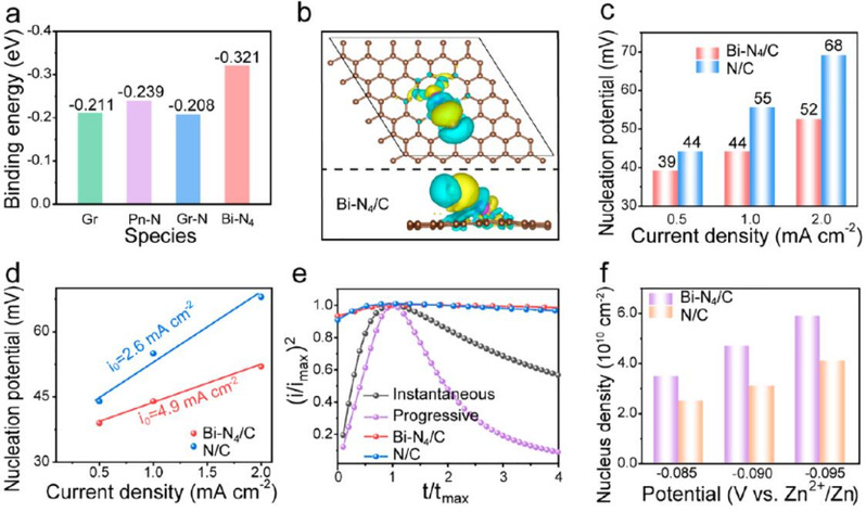 采用密度函数理论(DFT)计算了Zn原子和Bi-N4物种之间的相互作用。如图2a所示,Zn原子在不同位点上的结合能大小为:Bi-N4>吡啶N(Pn-N)>未掺杂C(Gr)>石墨N(Gr-N)。Zn吸附后,Zn和Bi-N4之间的局部电荷密度增加(图2b),表明Bi-N4位点与Zn原子结合力较强,并能引导Zn成核。