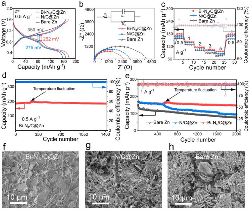 图5.−30°C时全电池的电化学性能。(a)充电−放电测试。(b)Nyquist图。插图: 等效电路。(c)倍率性能。(d)0.5 A g−1和(e)1 A g−1时的长循环性能。(f)Bi−N4/C@Zn,(g)N/C@Zn,(h)裸锌负极2000循环后的SEM图像。