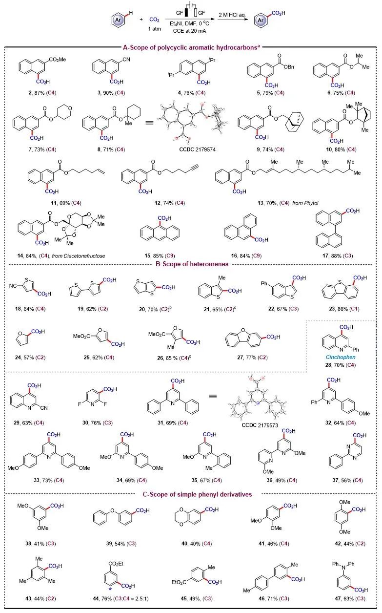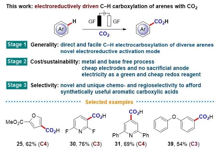 图1. 芳烃与CO2的电化学C−H羧化反应