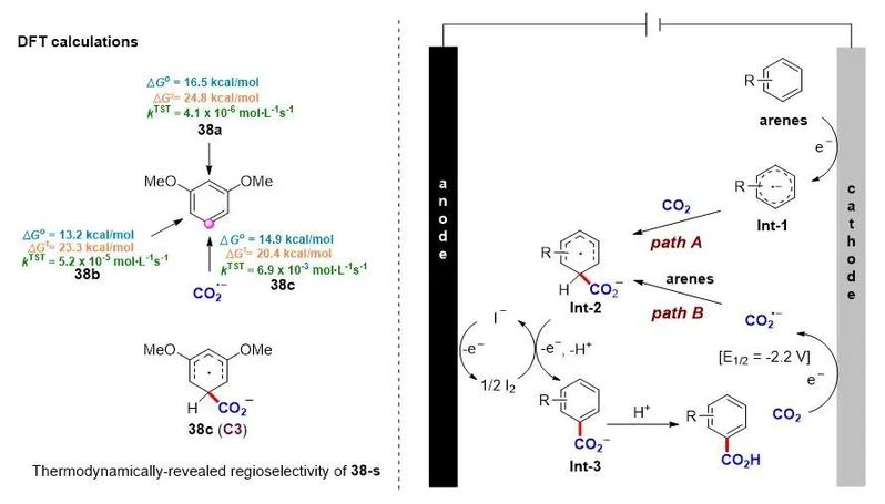 作者通过控制实验和循环伏安法(CV)实验对反应机制进行了研究。同时还进行了DFT计算(图3,左)。根据机理研究和文献报道,作者提出了可能的反应机理(图3,右):该反应可能是芳烃在阴极上直接还原形成相应的自由基阴离子Int-1引起的。然后,Int-1与CO2反应形成Int-2(路径A),其独特而高的区域选择性可能是由其电子效应决定的。Int-2被I2氧化失去H+生成Int-3,这可能是由芳构化驱动的。最后经质子化产生目标产物羧酸。Et4NI在阳极上被氧化,避免了牺牲阳极的使用。此外,对于还原电位比CO2更负的底物,如38等,CO2会优先在阴极上电还原形成自由基阴离子后与芳烃进行反应(路径B)。