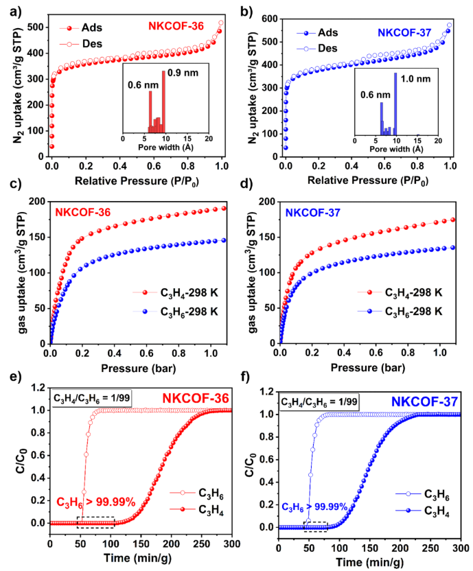 图3. (a, b) NKCOFs的氮气77 K等温吸-脱附曲线和孔径分布; (c, d) NKCOFs在298 K下丙炔、丙烯单组分吸附曲线;(e-f) NKCOFs对丙炔/丙烯(1/99, v/v)混合气体的穿透曲线