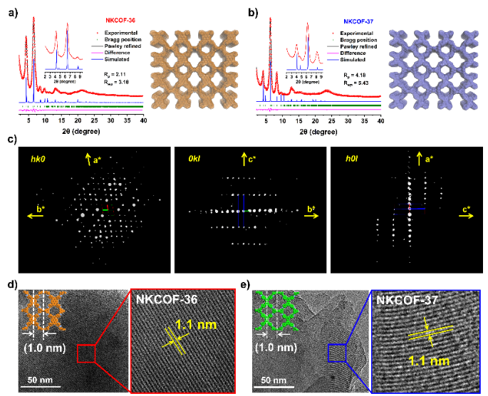 图2. 图2. (a, b) NKCOFs的PXRD谱图以及结构图示;(c) NKCOF-36的三维电子衍射数据;(d, e) NKCOFs的HRTEM图像