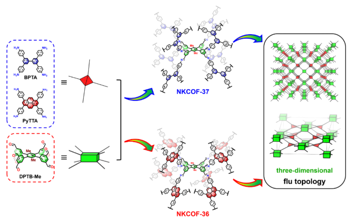 图1. 通过[8+4]的单体连接方式构筑具有flu拓扑的三维COFs