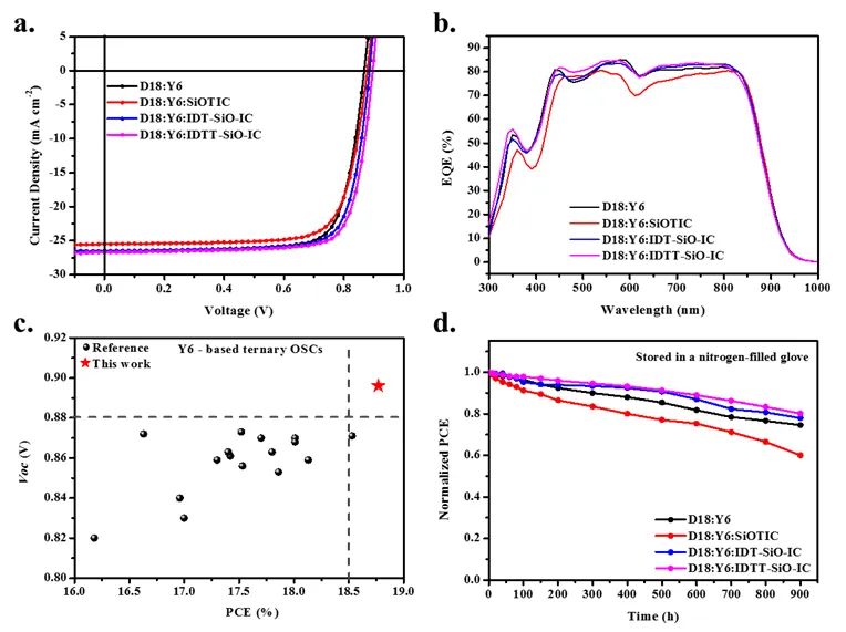 研究中,作者将新设计的两种杂化型FREAs,即IDT-SiO-IC和IDTT-SiO-IC作为客体受体材料与Y6,D18共混应用于三元OSCs中(器件性能如图2所示),其中将IDTT-SiO-IC以14.2wt%比例制备的器件取得了最高18.77%的PCE值,VOC增加到0.896 V,FF增加到78.37%,表现出优异的器件性能和稳定性。IDTT–SiO–IC作为该三元OSC客体受体的优异性能主要归因于与D18:Y6共混物的互补吸收、改进的结晶性、共混物膜形貌、良好混溶性以及D18、IDTT–SiO–IC和Y6之间的能级匹配。