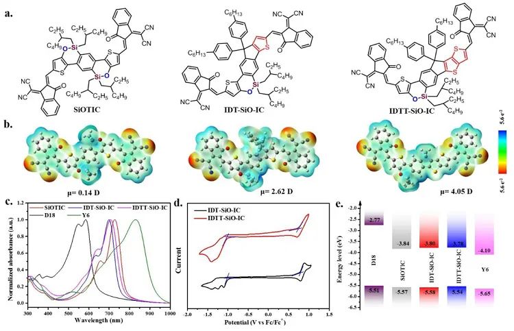 前人的研究证实,添加具有五元碳桥的IDT或IDTT衍生的A-D-A型FREAs作为客体受体,如MOIT-M、4-TIC、MeIC等能够显著改善基于Y6衍生物OSCs的性能。英国上市公司365赵东兵研究员课题组最近的研究表明,在A-D-A型FREAs中,将五元碳桥替换为六元硅氧桥对吸收光谱和能级的影响几乎可以忽略,但可以改善分子的结晶度、堆积和更高的电荷迁移率,这对优化薄膜形态非常有利,从而提高OSCs的填充因子 (FF)。基于此,赵东兵研究员联合山东大学高珂教授等,将IDT或IDTT衍生的FREAs和硅氧桥接的FREAs的结构进行融合,设计了如图1所示两种新型FREAs,即IDT-SiO-IC和IDTT-SiO-IC。他们期望可以结合两者的优点,进一步精细地微调它们的性能,如能级、分子堆积、混溶性和结晶度等。由于IDT-SiO-IC和IDTT-SiO-IC的吸收光谱与五元碳桥的IDT或IDTT衍生的A-D-A型FREAs相似,预计能够作为客体受体进一步改善基于Y6受体的有机太阳电池性能。此外,相互融合的结构使梯形骨架具有不对称性,这将导致更显著的偶极矩和介电常数,从而有利于增强分子间相互作用并降低激子结合能。