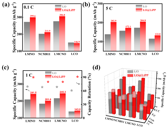 图3. 本文中的正极材料在改性前后(a) 0.1 C和(b)5 C下的放电容量。(c) 正极材料在1 C下循环150圈后的放电容量及容量保持率(由星型标记表示)(NCM811循环的电流密度为0.5 C)。(d) 本文中的层状正极材料在改性前后的电化学性能总结。