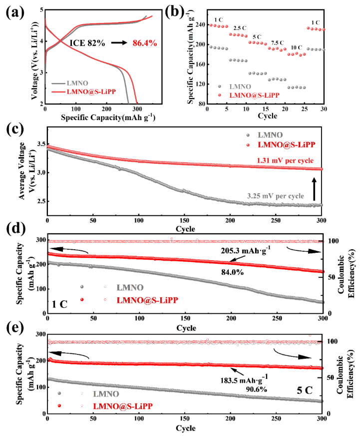 图2. LMNO和LMNO@S-LiPP半电池的电化学性能。(a) 0.1 C首圈容量-电压曲线。(b) 不同电流密度下的倍率性能。(c) 1 C循环过程中的平均放电电压。(d)1 C和 (e) 5 C电流密度下的循环性能。