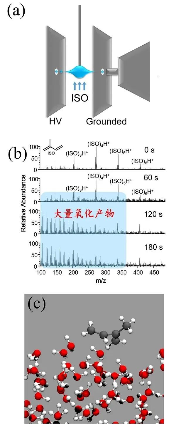 图1.(a)独特的FIDI-MS技术。(b)异戊二烯在气液界面被氧化成上百种氧化产物。(c)异戊二烯吸附在气液界面的理论计算。