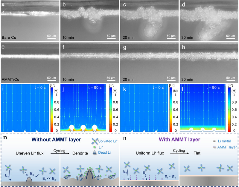 图4.(a-d)纯铜和(e-h)AMMT/Cu电极的原位光学图像。(i-j)纯铜和(k-l)AMMT/Cu电极的锂离子浓度分布和锂金属沉积模拟。(m)锂负极和(n)AMMT改性负极的沉积行为和相应机制示意图。