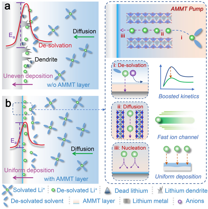 图1. 锂离子转移和沉积过程示意图。(a)纯锂金属负极。(b)AMMT改性锂负极。