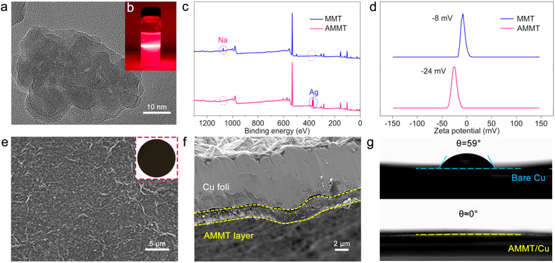 图2.(a)AMMT的TEM照片。(b)AMMT分散液照片。(c)MMT和AMMT的XPS谱图。(d)MMT和AMMT的Zeta电位。(e)AMMT/Cu电极的平面电镜图和(f)横截面电镜图。(g)Cu和AMMT/Cu电极的电解液润湿性测试。