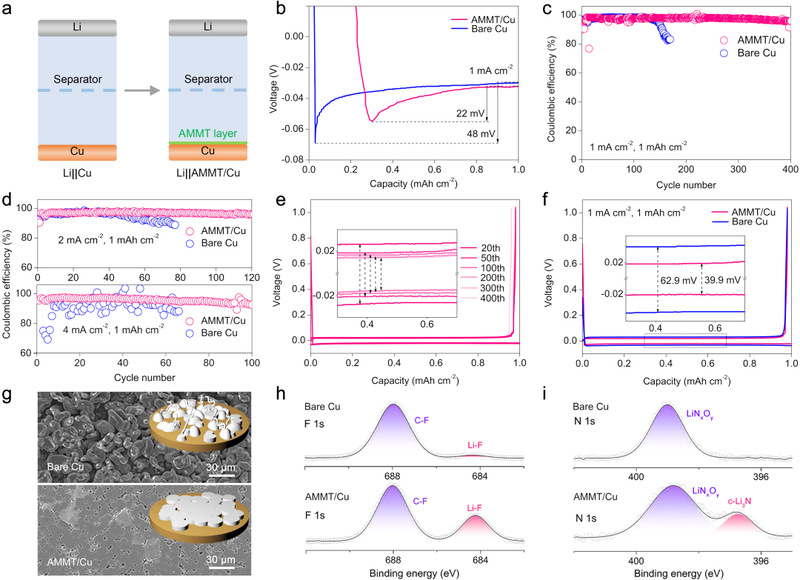 图3.(a)锂-铜电池的结构示意图。(b)不同电极的沉积过电势。(c-d)不同电流密度的Li||Cu和Li||AMMT/Cu电池的库仑效率循环。(e)图c中特定圈数的充放电曲线。(f)不同集流体的第50圈充放电曲线。(g)锂在不同电极上的沉积形貌。(h-i)循环后不同电极表面F 1s和N 1s的XPS谱图。