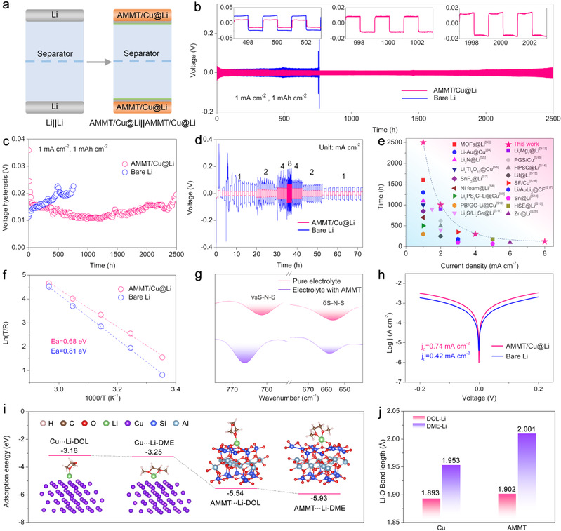 图5.(a)对称电池结构示意图。(b)在电流密度为1 mA cm–2,沉积容量为1 mAh cm–2下对称电池的时间电压曲线。(c)图b中对称电池的中值电压。(d)对称电池电化学倍率性能。(e)与已发表文章的性能比较。(f)活化能拟合图。(g)S-N-S基团的拉伸振动峰和剪切振动峰的红外光谱。(h)AMMT不同电池的Tafel曲线。(i)溶剂配位锂与不同基底之间的吸附能。(j)图i模型中,锂和溶剂氧原子之间的键长。