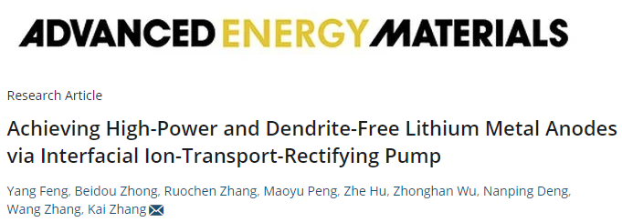 Yang Feng, Beidou Zhong, Ruochen Zhang, Maoyu Peng, Zhe Hu, Zhonghan Wu, Nanping Deng, Wang Zhang, Kai Zhang*. Achieving High-Power and Dendrite-Free Lithium Metal Anodes via Interfacial Ion-Transport-Rectifying Pump, Advanced Energy Materials, 2023.