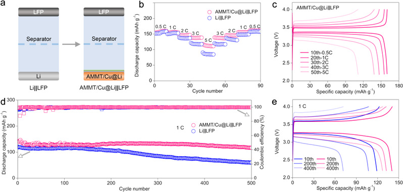 通过组装全电池来评估电极实际应用的稳定性(图6a)。如图6b所示,基于AMMT电极的电池在5 C下具有111.2 mAh g-1的高容量,并在不同电流速率下保持较小的极化,而纯锂负极展现出较低的容量(图6c)。此外,改性电极在1C的电流密度下,能够实现500次稳定循环(图6d)。相反,基于纯锂负极的全电池具有较低的容量和严重的极化(图6e)。总之,AMMT离子整流泵不但提升了界面离子动力学,同时实现了稳定的锂沉积行为。