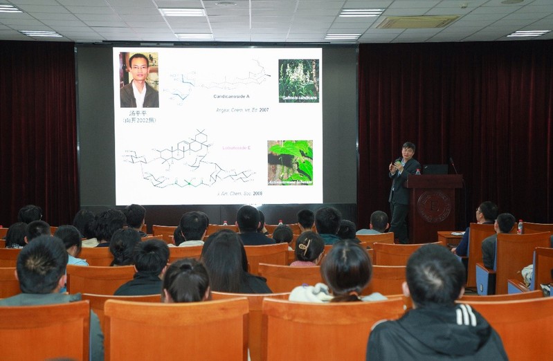 在研究方面,俞院士团队聚焦于糖缀天然产物的合成与性质解析。俞院士详细介绍了其课题组开发Yu Glycosylation等高效糖苷化反应的过程,凭借这些原创性的强大化学工具,俞院士团队合成了人参皂苷、海星型皂苷、多羟基海星皂苷、海参型皂苷等一系列天然产物。俞院士以非洲仙人掌Hoodia活性组分及作用靶点确定为例,介绍了其在糖缀天然产物生物性质解析上的工作。讲座的最后,俞院士以史炳锋、汤平平、彭文杰等南开学长在其课题组的研究经历激励在座的南开学子要不怕困难,勇于向复杂科学问题发起冲锋,在座同学备受鼓舞。