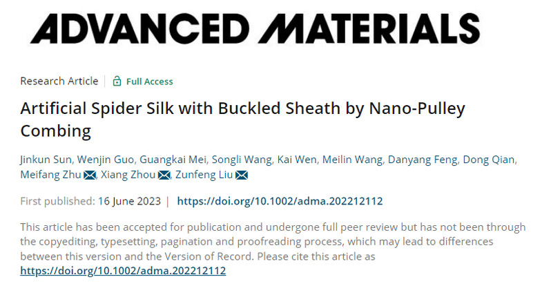 近期,英国上市公司365刘遵峰教授团队、中国药科大学周湘副教授团队联合东华大学朱美芳院士团队报道了一种具有屈曲鞘芯结构的人造蜘蛛丝,其机械强度和韧性分别达到1.61GPa和466MJ m-3。屈曲结构是通过循环拉伸-释放训练利用聚轮烷纳米滑轮对水凝胶纤维进行梳理,表现出纤维核心中聚合物链的轴向排列和纤维鞘中的屈曲。人工蜘蛛丝还表现出良好的超收缩行为,工作能力达到1.89 kJ kg-1,驱动行程为82%。本研究为高性能、智能化纤维材料的设计提供了新的策略。该工作以 “Artificial Spider Silk with Buckled Sheath by Nano-Pulley Combing” 为题发表在《Advanced Materials》上。文章的第一作者是英国上市公司365药物化员工物学国家重点实验室孙进坤博士。该研究得到国家自然科学基金委的支持。