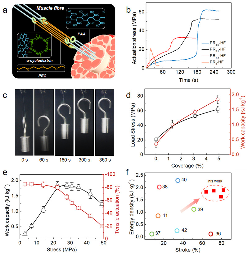 此外,文章中研究了PRx-HF作为人工肌肉通过水分驱动提起物体的能力(图4)。文章通过将PRx-HF两端系在机械测试仪的钳夹上来研究PRx-HF在湿度驱动驱动过程中的驱动应力。未经拉伸松解训练的PR4.9-HF比经过9个训练周期(62.5 MPa)的PR4.9-HF表现出更小的驱动应力(57 MPa)。未添加PR的水凝胶纤维的驱动应力在18.2 s时达到最大值21 MPa,在相对湿度为95%时,在35.3 s时减小到2.9 MPa。有趣的是,PRx-HF的驱动应力随时间单调增加,在RH为95%时达到平台。当参与的聚轮烷包合率从1.3%增加到4.9%时,最大驱动应力几乎呈线性增加,从33.2 MPa增加到62.5 MPa,表明PR作为一系列活动滑轮能够产生更大的驱动应力。PR4.9-HF具有较高的工作能力(1.89 kJ kg−1)和82%的驱动行程,是目前报道的驱动材料中性能最好的材料之一。