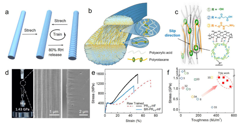 许多天然材料同时表现出高强度和高韧性,如蜘蛛丝、珍珠贝、木材和竹子、骨骼等。受这些天然材料的启发,文章中通过模拟皮肤-核心的异质结构,提出了一种提高纤维强度和韧性的鞘芯机制,旨在制备一种强韧人造蜘蛛丝。这种结构通过使用聚轮烷(PR)交联剂对水凝胶纤维进行周期性拉伸释放训练来实现(图1)。在PR梳理的辅助下,纤维拉伸增加了聚合物链的轴向排列,随后的应变松弛导致排列好的聚合物链在纤维鞘中再结晶。通过9次的拉伸释放循环形成这种屈曲的鞘芯结构。