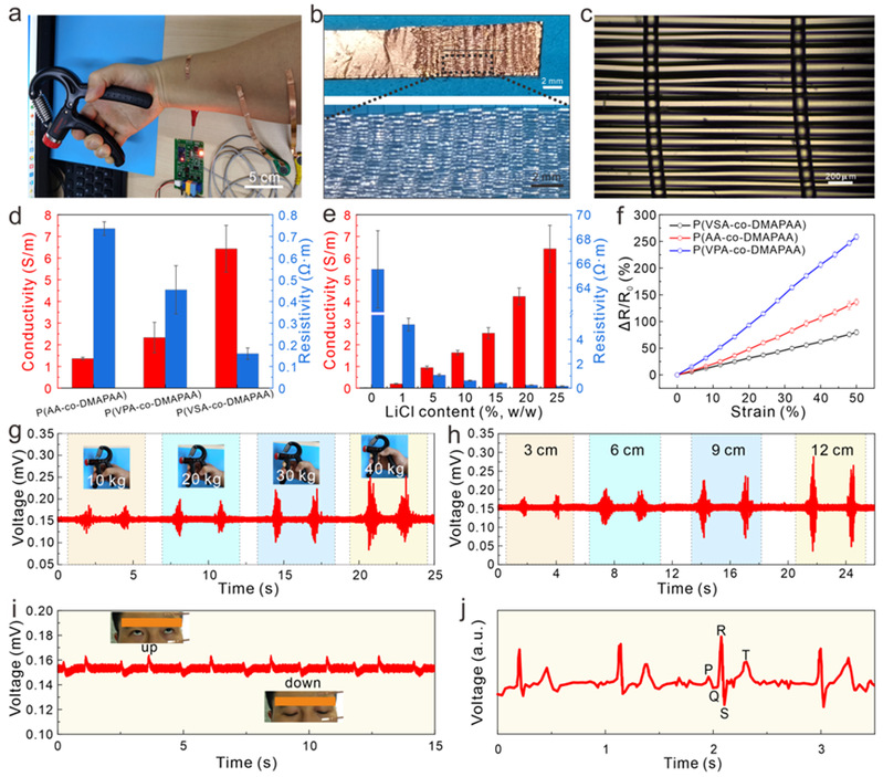 神经元纤维可以在人体组织器官间通过离子传导来通信和传输信号。类似地,在人机交互系统中也需要有良好的界面兼容性来检测来自人体皮肤的电信号并收集到仪器设备中。因此,界面粘附以及良好电信号传导对于人机交互界面电极材料是非常重要的。文章研究了PrDA纤维的离子导电性能,并将其作为界面传导层来捕获人体皮肤的电信号,获取人体的ECG和EMG信息(图4)。