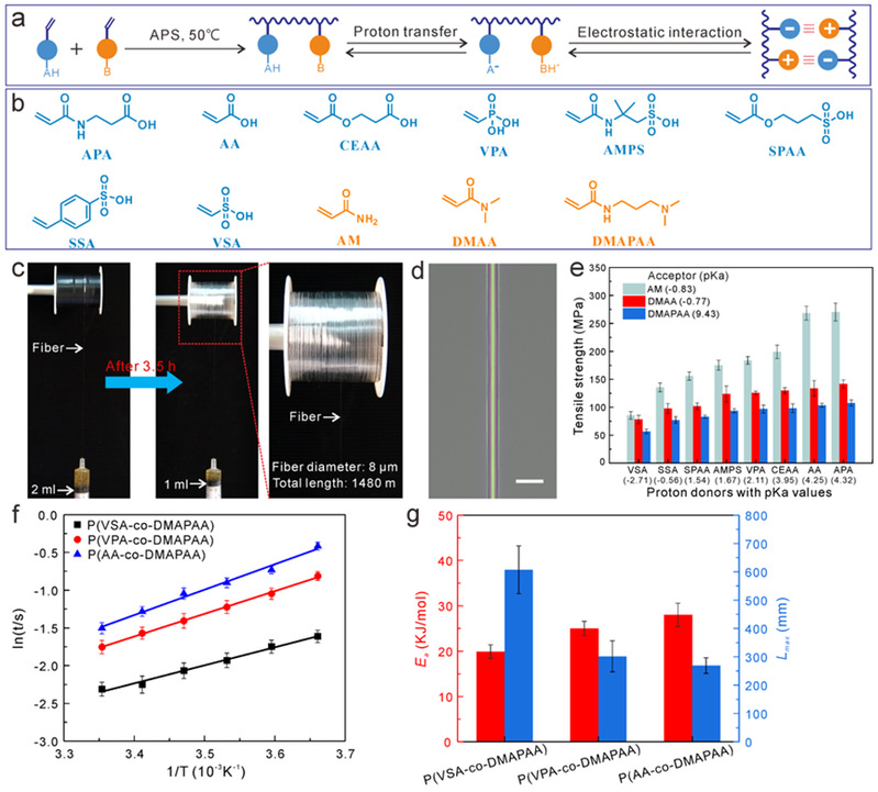 将相同摩尔量的质子供体单体和质子受体单体通过自由基聚合制备了一系列不同质子供体-受体序列的PrDA水凝胶。类似于两性离子生物分子,如氨基酸和蛋白质,质子可以从质子供体的酸性基团转移到质子受体的碱性基团,从而生成阴离子和阳离子基团,再通过分子链之间的静电相互作用物理交联而成胶(图2ab)。通过仿生蜘蛛的纺丝过程,将PrDA水凝胶牵引纺丝制备PrDA纤维。