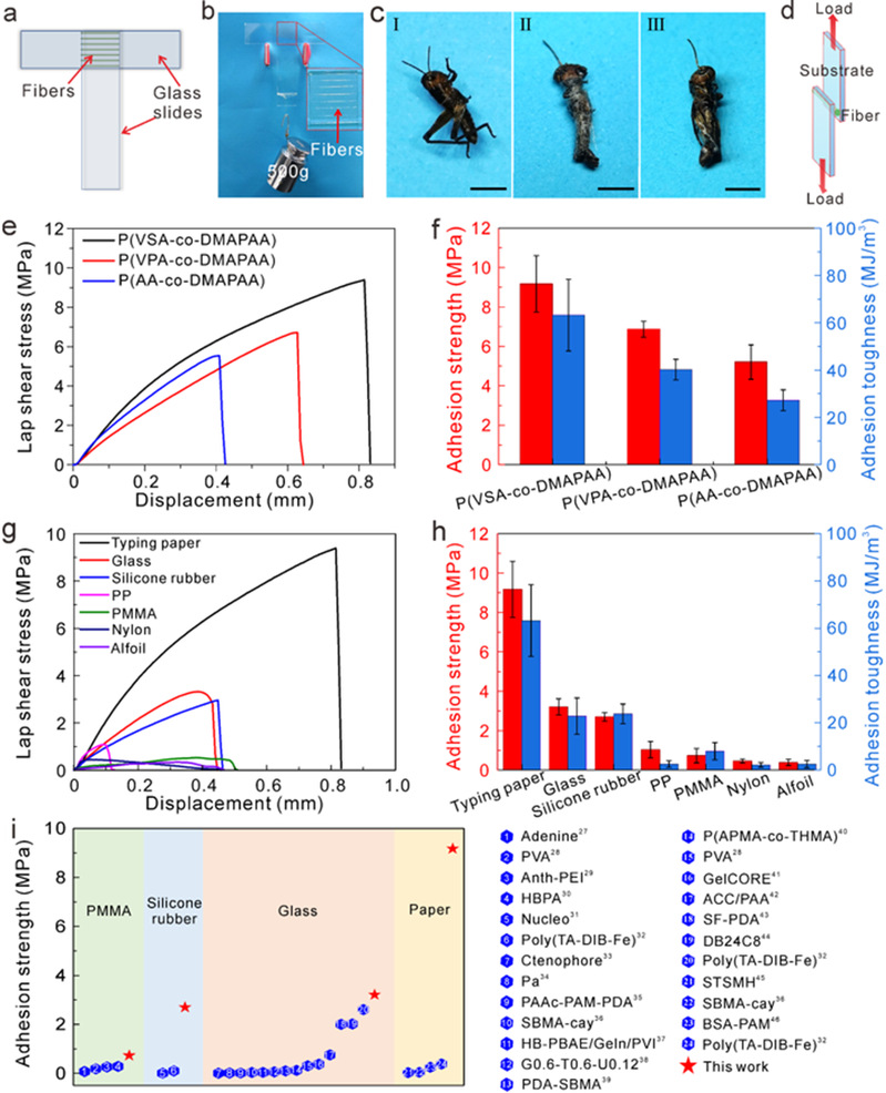 与粘性蜘蛛丝类似,PrDA纤维对多种材料都表现出很强的粘附力。由P(VSA-co-DMAPAA)纤维编织的人造蜘蛛网可以粘附多种材料,包括纸张、玻璃、硅橡胶、尼龙、铝箔、聚丙烯(PP)和聚甲基丙烯酸甲酯(PMMA)。这应归因于两性离子聚合物链中存在阴离子、阳离子和脂肪族链段,它们通过各种分子间作用机制与不同基底表面相互作用,包括氢键、离子-偶极相互作用、静电相互作用、范德华相互作用、偶极-偶极相互作用和金属络合等。另外,通过粘附剪切应力测量, PrDA纤维对印刷纸的剪切应力和剪切韧性分别为9.17 MPa和63.22 MJ·m-3(图3),这是已知报道中粘附水凝胶材料中最好的。