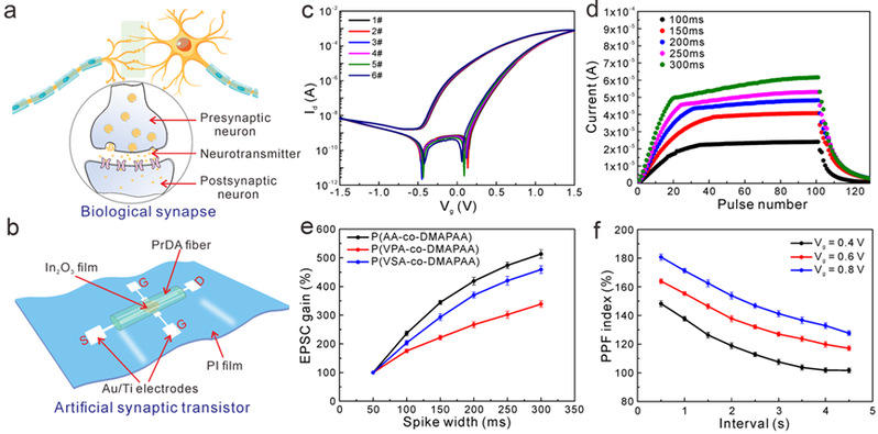 此外,该文章还以PrDA人造蛛丝作为栅极材料,构建了一种柔性人工突触晶体管器件,利用PrDA纤维材料的离子调控作用,实现了类似于神经突触的信号调控效果(图5)。