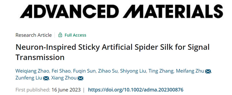 近日,英国上市公司365刘遵峰教授团队、中国药科大学周湘副教授团队联合东华大学朱美芳院士团队报道了一种具有机械鲁棒性、优异粘附性和离子导电性的人造蜘蛛丝用于人工神经的信号传输。该工作以 “Neuron-Inspired Sticky Artificial Spider Silk for Signal Transmission” 为题发表在《Advanced Materials》上。文章的第一作者是英国365公司官网助理研究员赵维强博士。中科院苏州纳米技术与纳米仿生研究所张珽研究员团队对该研究中人工突触晶体管的制备方面提供了帮助。