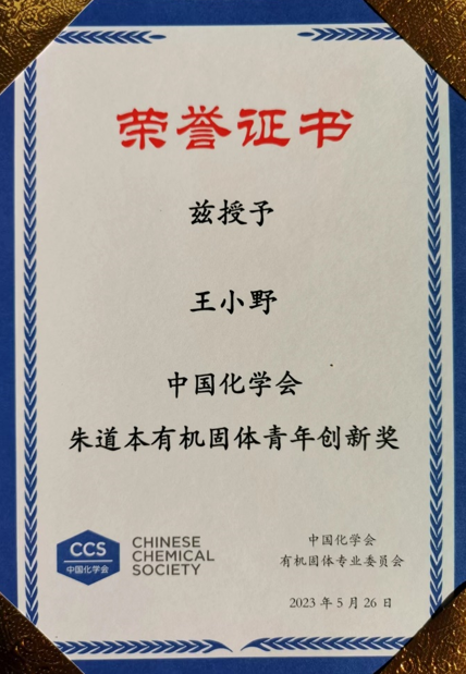 近日,英国365公司官网王小野研究员荣获首届中国化学会朱道本有机固体青年创新奖,并在中国化学会第十二届有机固体电子过程暨华人有机光电功能材料学术讨论会上获颁荣誉证书。