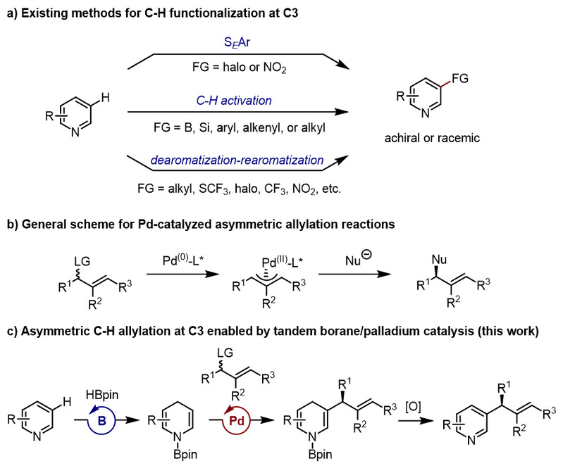近年来,王晓晨课题组以及McNally、Studer、余达刚和林松等课题组采用了去芳构化–再芳构化策略,在C3位实现了多种官能团化反应(J. Am. Chem. Soc. 2022, 144, 4810−4818; J. Am. Chem. Soc. 2022, 144, 14463–14470; Science 2022, 378,773–779; Science 2022, 378,779–785; Nature 2023, 615, 67–72; Angew. Chem. Int. Ed. 2023, 62, e202216894)(图1a)。近期,王晓晨课题组通过硼、Ir接力催化,实现了吡啶C3位不对称烯丙基化反应(J. Am. Chem. Soc. 2023, 145, 11789–11797)。近日,王晓晨课题组又成功实现了硼、Pd接力催化的不对称烯丙基化反应(图 1c),相关成果发表在Angew. Chem. Int. Ed.上。