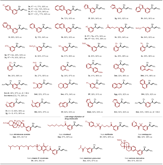 该反应分三步进行:首先,在B(2,4,6-F3C6H2)3催化下,吡啶底物与频哪醇硼烷(HBpin)反应,生成二氢吡啶;随后,在手性钯催化剂作用下,二氢吡啶与原位生成的钯烯丙基络合物反应,得到烯丙基取代的二氢吡啶;最后,空气氧化得到目标产物。该反应适用于多个位置单取代和多取代吡啶以及喹啉、异喹啉、吡啶并噻吩、吡啶并呋喃等杂芳环化合物。此外,作者成功将该方法应用于修饰多种吡啶药物分子(图2)。