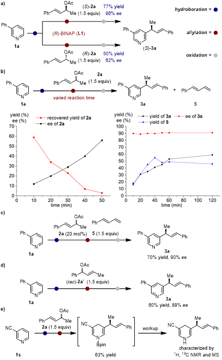 Pd催化的不对称烯丙基化反应(Tsuji-Trost反应)是一类重要的有机合成方法,通过亲核试剂与原位生成的钯烯丙基络合物反应,可以高效、高选择性地构筑烯丙基取代的有机化合物(图 1b),而且,Pd催化体系与Ir催化体系具有互补的位置选择性(Pd: 亲核试剂进攻烯丙基络合物位阻较小的一侧vs. Ir:亲核试剂进攻烯丙基络合物位阻较大的一侧)。王晓晨课题组发现,通过硼、Pd接力催化,不但可以获得结构多样、高光学纯度的吡啶C3位烯丙基化产物,而且,三取代(R1, R2, R3 ≠ H)和非对称烯丙基酯(R1 ≠ R3)等高难度底物在反应中表现出较高的活性和位置选择性(图 1c)。