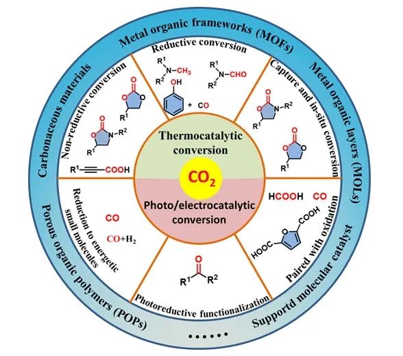 图2介绍了碳材料和金属有机框架(MOFs)在热催化CO2转化为化学品方面的应用。在热催化的CO2转化过程中,由于CO2分子的热力学稳定性,CO2的转化有赖于高能底物的使用。同时,底物和CO2分子的协同活化。有助于降低反应活化能,实现温和条件的高效转化。包含多个催化位点的纳米材料,特别是碳材料和MOFs,为协同活化CO2和底物提供了条件。碳材料本身具有巨大的比表面积,并包含丰富的官能团和缺陷结构,这为催化单元的引入和负载提供了前提,此外,通过杂原子掺杂,还能调控碳材料表面的电子分布,从而形成新的催化活性中心。MOFs材料则具有极大的可设计性,可调的空腔大小、金属结点以及有机桥连配体结构,有利于设计复合催化材料。通过合理设计具有多活性位点的碳材料和MOFs,有效实现了CO2的非还原转化和还原转化。