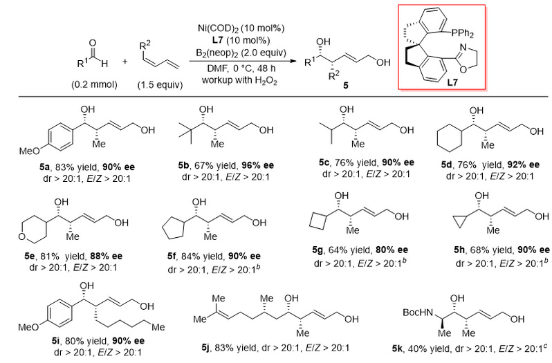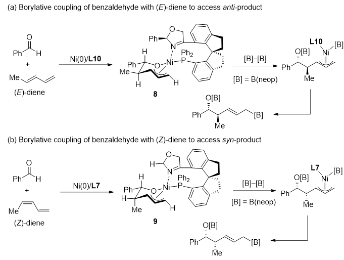 图4. 镍催化(Z)-1,3-二烯和醛的不对称硼化偶联反应。图片来源:J. Am. Chem. Soc.
