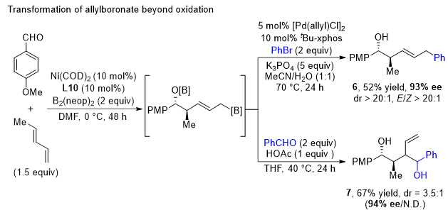 图2. 镍催化1,3-二烯和醛的不对称硼化偶联反应。图片来源:J. Am. Chem. Soc.