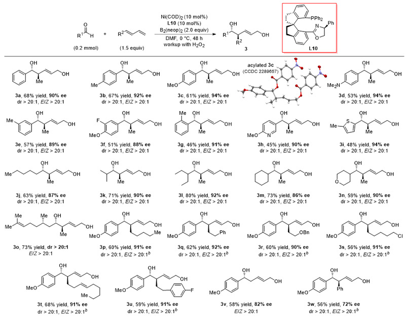 通过系统的反应条件优化,作者发现了手性螺环膦-噁唑啉/镍络合物(Ni/L10)是催化1,3-二烯与醛硼化偶联反应的有效催化剂,并成功实现了(E)-1,3-二烯与醛的不对称硼化偶联反应,以中等及以上的收率和优异的非对映选择性和对映选择性得到anti构型的产物(图3)。