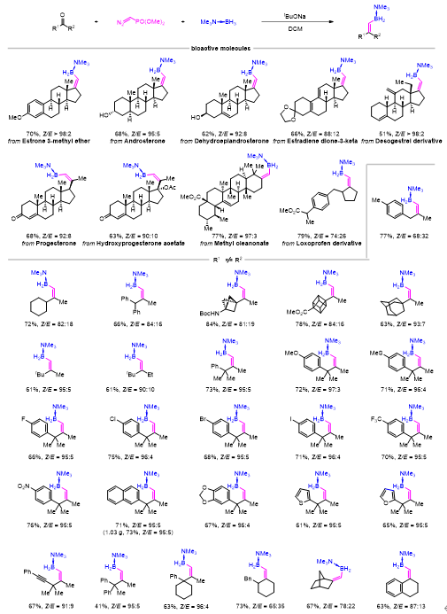 该反应使用双烷基酮作为底物,重氮甲基磷酸二甲酯作为Wittig试剂,叔丁醇钠作为碱,硼烷-三甲胺作为硼试剂,-78 - -40 oC下反应2小时,即可得到目标烯基硼产物(图3)。对不对称脂肪酮(R1 ≠ R2),增加R1和R2之间的立体位阻差异,即可获得优异的立体选择性。反应的底物适用范围较广,许多类固醇及其衍生物可以成功应用于该反应中,给出良好的产率和优异的Z选择性。在酮的芳基上引入具有不同电性的取代基以及稠环、芳杂环和炔基取代基对反应的产率和立体选择性没有明显影响。将反应扩大至克级规模时,产率和选择性都得到了很好的保持。