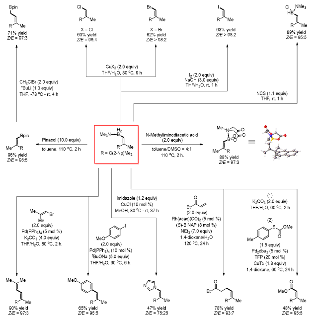 产物中的C-B键可方便地进行卤代、偶联、加成等多种反应,转化为C-C键和多种官能团,转化过程中双键的构型都能很好保持,这表明本方法具有很好的合成应用潜力(图5)。值得注意的是,这里合成的大部分Z-烯烃产物都很难直接通过Wittig反应合成。