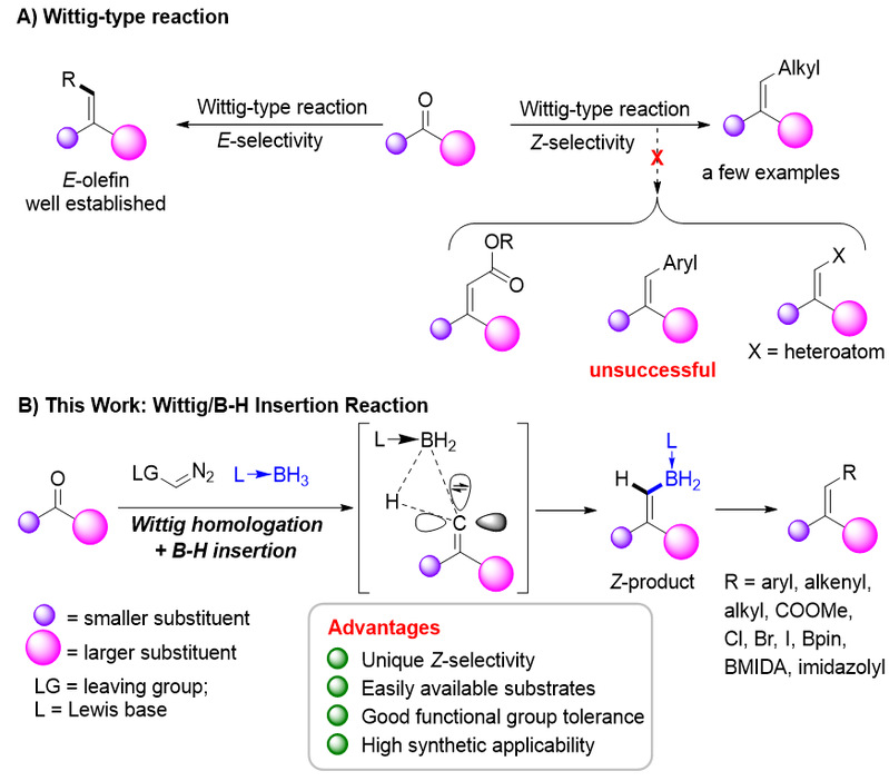 烯烃是一类重要的有机化合物,发展烯烃的合成新方法一直是化学家们关注的焦点。Wittig反应作为一类高效合成烯烃的方法,具有原料易得、底物适用范围广、官能团耐受性好、产率高、操作简单等优点,是最可靠、最实用的烯烃合成方法之一。然而,该方法通常给出热力学稳定的E式构型烯烃产物,在热力学不稳定的Z式构型的选择性合成方面仍存在一些困难,尤其在以酮为底物合成三取代Z式烯烃方面,存在巨大挑战。目前,酮的Z式选择性Wittig反应只能通过使用高活性的烷基Wittig试剂来实现,因而其产物类型局限性很大(图 2A)。因此,开发合成Z-三取代烯烃的合成新策略具有重要意义。