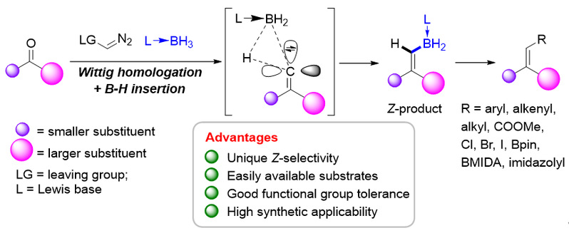 总之,朱守非课题组报道了一类新颖的Wittig/B-H插入反应,可以在脂肪酮化合物中添加一个碳原子并引入一个硼基团来构建烯基硼化合物,给出Wittig反应难以获得的Z-式选择性。这些硼烯烃产物可以进行立体专一的转化得到多种三取代Z式烯烃,具有广阔的应用前景。此外,他们还实现了分子内Wittig/B-H插入反应,从而构建了多种新型非芳香性含硼杂环化合物。DFT计算显示,独特的Z式选择性源于B-H键插入这一基元过程中过渡态轨道最大重叠的需求。该工作拓展了B-H插入的反应类型,深化了对B-H插入反应机理的理解,为三取代Z式烯烃的合成提供了新的实用方法。