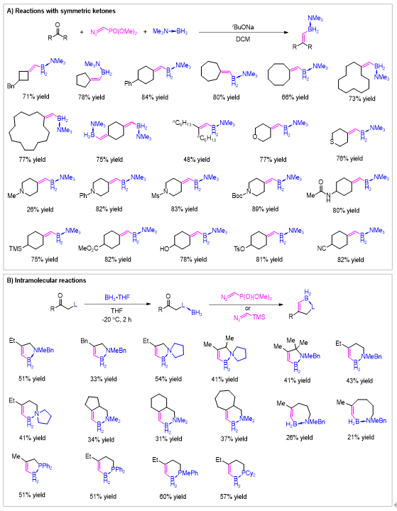 各类对称的酮,包括环酮和链状酮都适用于该反应,在标准条件下顺利给出目标的烯基硼化合物(图4A)。