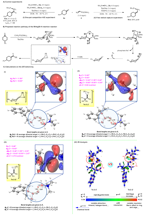 在反应机理方面,作者通过氘代实验证明,反应的亚烷基卡宾对B-H的插入过程可能经历协同过程,并通过加入TEMPO作为自由基捕获剂排除了自由基历程(图6A)。作者提出反应经历三个阶段(图6B),首先叔丁醇钠对重氮甲基膦酸二甲酯脱氢生成碳负离子,碳负离子在Na+的作用下进攻羰基碳,经历Wittig过程脱氧得到亚烷基重氮化合物,然后脱重氮得到亚烷基卡宾中间体。硼烷加合物中富电子的氢靠近卡宾的空轨道,随后经历三元环过渡态得到B-H插入产物。反应的选择性是在卡宾对B-H键的插入过程产生的。最后,作者通过DFT计算对反应选择性的产生给出了解释(图6C)。在插入反应过程中,亚烷基卡宾以单线态形式参与反应,其孤对电子分布于卡宾碳的顶端,此时孤对电子和卡宾双键相互远离,排斥最小。在B-H键的插入过程中,硼烷加合物的富电子氢与卡宾碳原子一侧的空轨道结合,形成络合物,紧接着经过一个三元环过渡态,电子从硼氢键流向碳氢键,同时硼原子转移到碳原子上。由于Ts-1中卡宾双键的取代基对硼烷加合物的位阻效应比其他情况下都要小,因此这个过渡态中卡宾碳与硼和氢的中心轨道的重叠程度比其他任何过渡态中都要大。以此为标准,在Z和E选择性插入的过渡态中,前者的轨道重叠程度要大于后者,因此可以认为E式选择性过渡态的成键轨道重叠程度更低,成键时需要克服更高的能垒。通过IRI分析作者发现,插入过程的阻力主要存在于卡宾碳对硼烷加合物配位的Lewis碱的位阻作用及硼原子与亚烷基卡宾取代基之间的相互作用。对于两种选择性的过渡态来说,硼原子与亚烷基卡宾取代基之间的相互作用存在比较明显的差异,Z式选择性的过渡态排斥力更小。