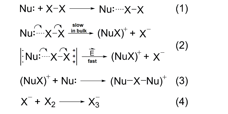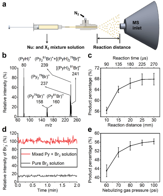 近日,为了拓展微液滴表面电场的适用范围从而解决真空中电场技术的放大问题,英国上市公司365张新星研究员通过利用微液滴表面极高的电场,实现了定向加速亲核试剂(Nu:)进攻卤素(X2)并打破卤素键(X-X)。在非极性或极性溶剂中,Nu:(吡啶或奎宁环)会与卤素(Br2或I2)迅速结合,生成卤键复合物(Nu···X-X)。在极性溶剂中,该复合物会缓慢解离为 (NuX)+和X-,前者可以再结合一个Nu:分子生成(Nu2X)+(图1)。然而,在体相溶液中,该解离过程因具有较高的能垒而进行得十分缓慢,以至于需要数天甚至数周。在该工作中,作者使用十分简便的氮气喷雾和质谱检测的方法,将Nu:与Br2或I2的混合溶液喷洒为微液滴,无需底物和水之外的任何物质的加入,随后即可在质谱中观测到 [Nu1,2(Br/I)]+的质谱峰,证明在微液滴中该反应只需微秒级的时间就可自发发生,将反应速率提高了数个数量级。当作者改变反应距离由10 mm增加至30 mm时,可以发现反应产物 (Py1,2Br)+ 的产率显著提高,进一步验证了反应是在微液滴中发生的(图2c)。由图1中的反应步骤(4)可以推断,反应的发生将会促进Br3-阴离子的生成,作者在相同条件下,持续向质谱仪中分别喷雾同一浓度的纯Br2溶液和Py+Br2混合溶液2 min,通过对比Br3-阴离子的相对强度,可以发现在Py+Br2混合溶液中Br3-阴离子的强度约为纯Br2溶液的6倍,进一步验证了该反应的机理(图2d)。为了进一步阐释气-液界面在反应中确实扮演重要角色,作者通过改变鞘气压力由60 Psi至100 Psi,由计算发现反应产物(Py1,2Br)+会随着鞘气压力的增加而显著提高,这是由于增大鞘气压力会减小微液滴的尺寸,进而能增大微液滴的比表面积,进一步说明了气-液界面在化学反应中的重要性(图2e)。