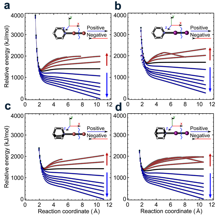 在理论计算方面,作者利用密度泛函理论,分别对PyBr2、PyI2、(QNL)Br2和(QNL)I2 (将奎宁环简写为QNL) 四个不同体系进行了理论预测。当电场达到~109 V/m,且与NuX-X键断裂的方向一致时,(NuX)+上的正电荷以及X-上的负电荷能够得以稳定,从而降低甚至消除了卤素键异裂的能垒。如果将电场的方向倒置,X-X键将被重新稳定,从而会增大反应能垒(图3)。因此,这些理论结果解释了实验中的超高反应速率,证明了微液滴自发产生的超高电场可以显著降低卤键断裂的能垒,从而使反应速率明显加快。值得注意的是,在水中电场降低能垒的效应要比在气相中更明显,这可能是由于被水分子包围的NuX-X键更容易被极化导致。